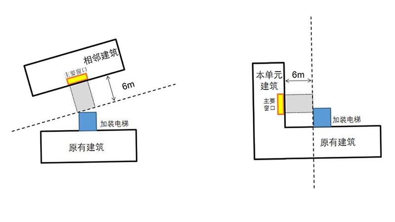增设电梯方案的梯井(或连廊)与本交通单元内住宅或相邻住宅主要使用房间(卧室或起居室)窗户的正投影净距小于 6 米,可视为严重遮挡,如下图所示: